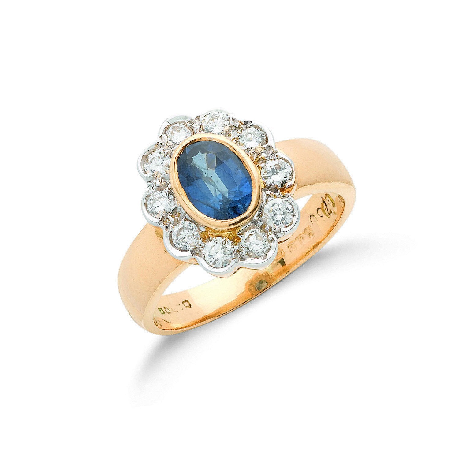 This exquisite cluster ring effortlessly combines the luxury of 18ct yellow gold with the elegance of a 0.80ct blue sapphire, surrounded by 0.36ct of sparkling diamonds, making it a truly unique piece of jewellery.