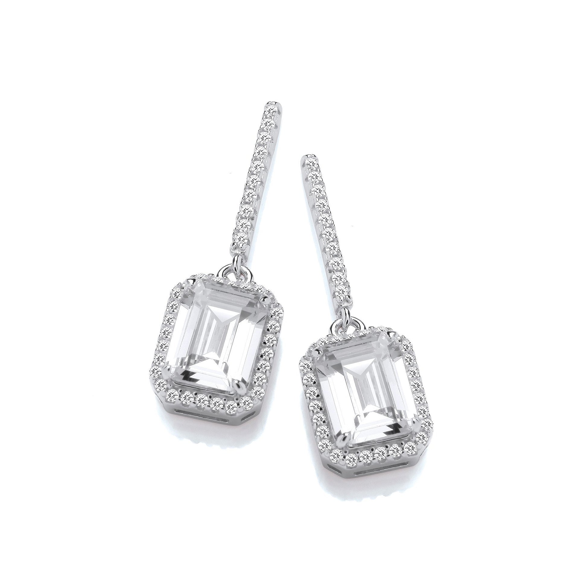 Emerald Cut Cubic Zirconia Halo Silver Drop Earrings