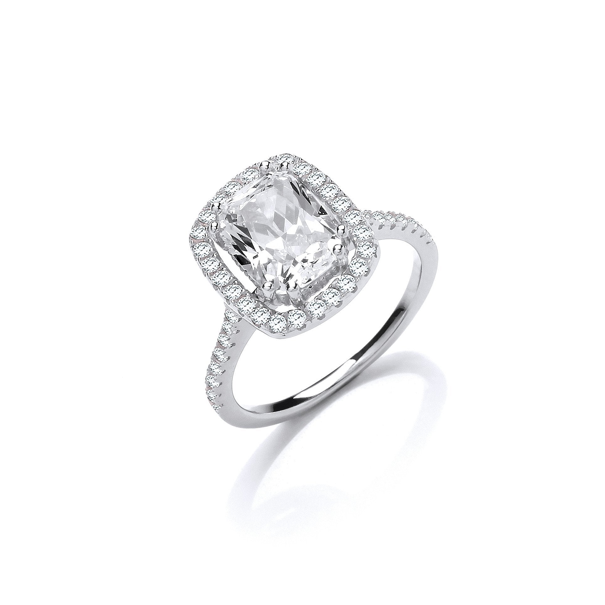 This exquisite Halo Style ring is a masterpiece of jewellery, featuring a stunning emerald cut Cubic Zirconia stone that effortlessly combines elegance with sophistication.