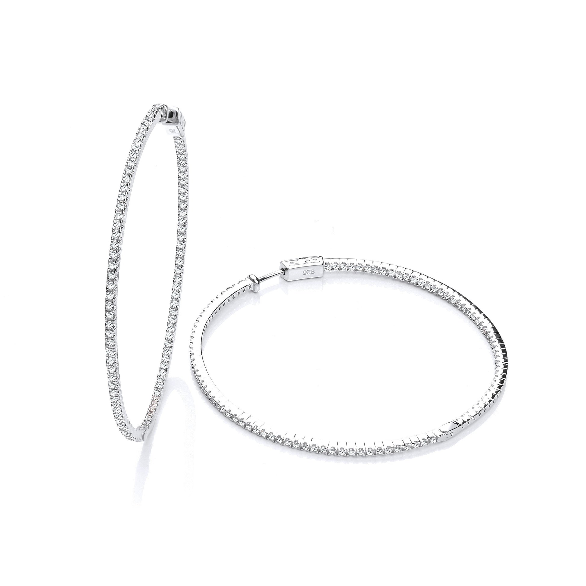 Exquisite and understated, these Micro Pave 60mm Round Hoop Cubic Zirconia Earrings in sterling silver embody the essence of refined jewellery. Their sleek, rounded design strikes the perfect balance between modern sophistication and timeless elegance.