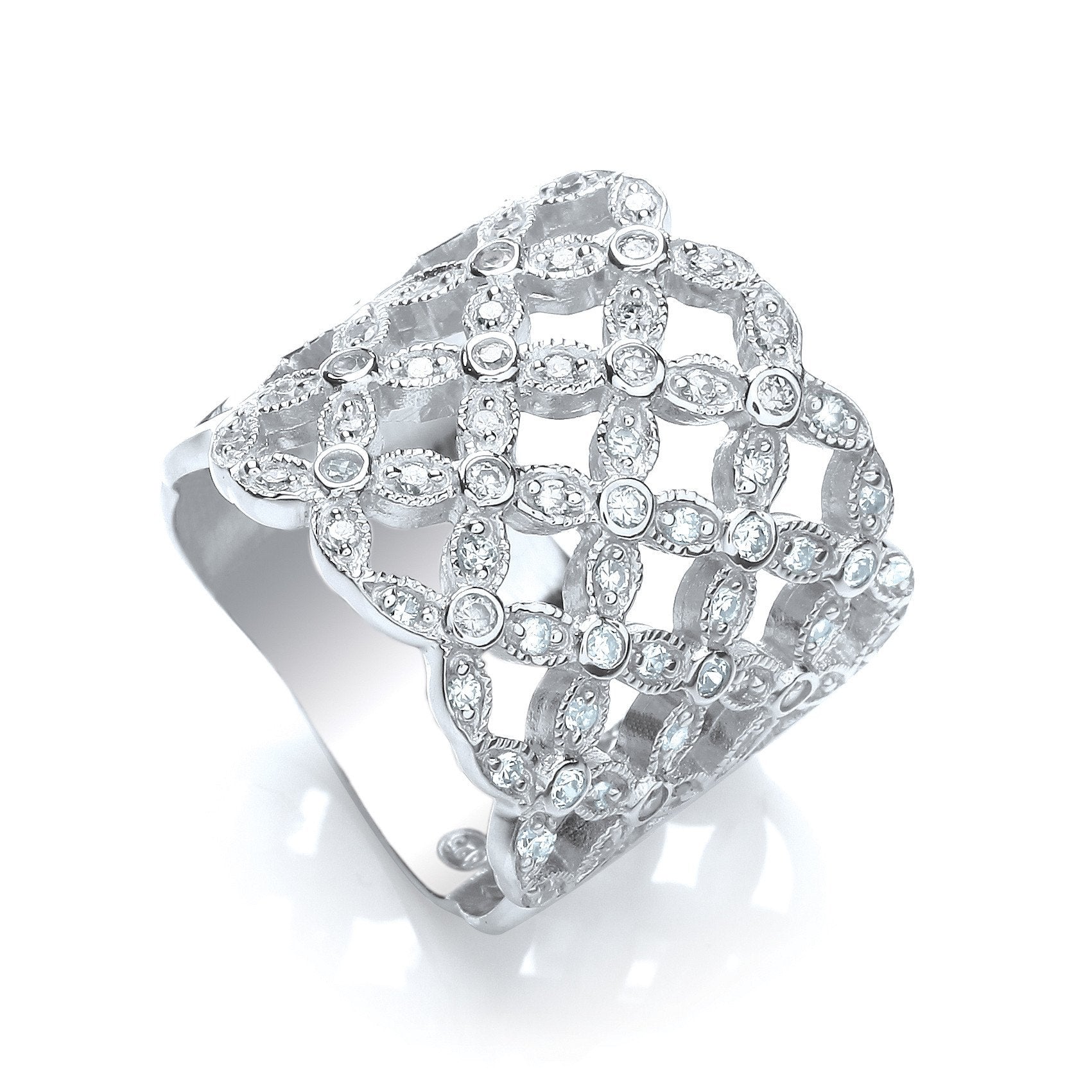 This exquisite Multi-Row Fancy Flower Cubic Zirconia Ring is a stunning addition to any jewellery collection, perfect for indulging in a touch of everyday sophistication.
