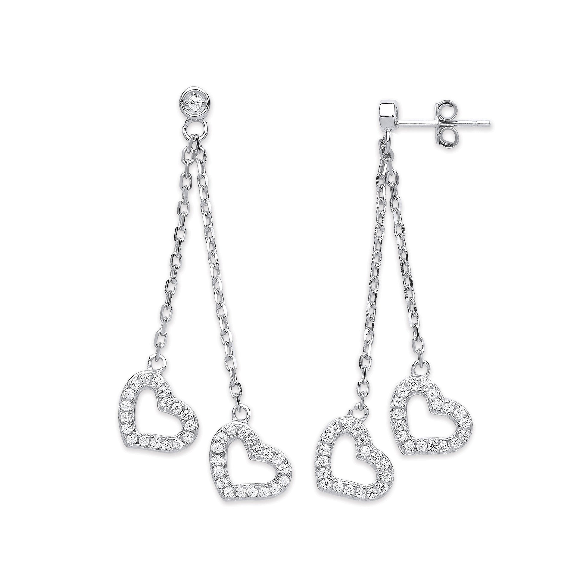 Silver 2-Strand Cubic Zirconia Hearts Drop Earrings