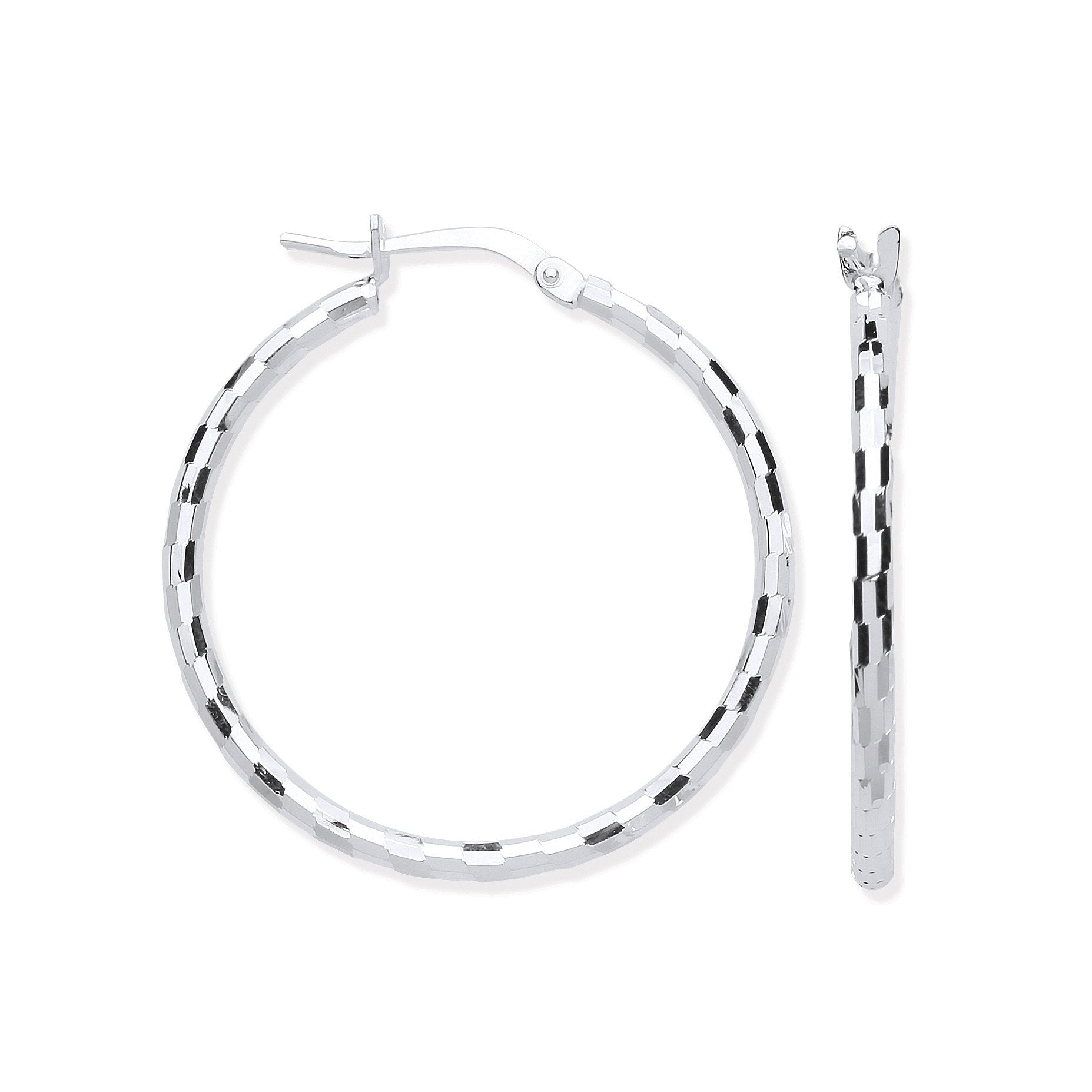 This 25mm silver hoop earring effortlessly combines classic style with a modern twist, featuring a striking checkerboard design that adds a dash of visual interest to any outfit.