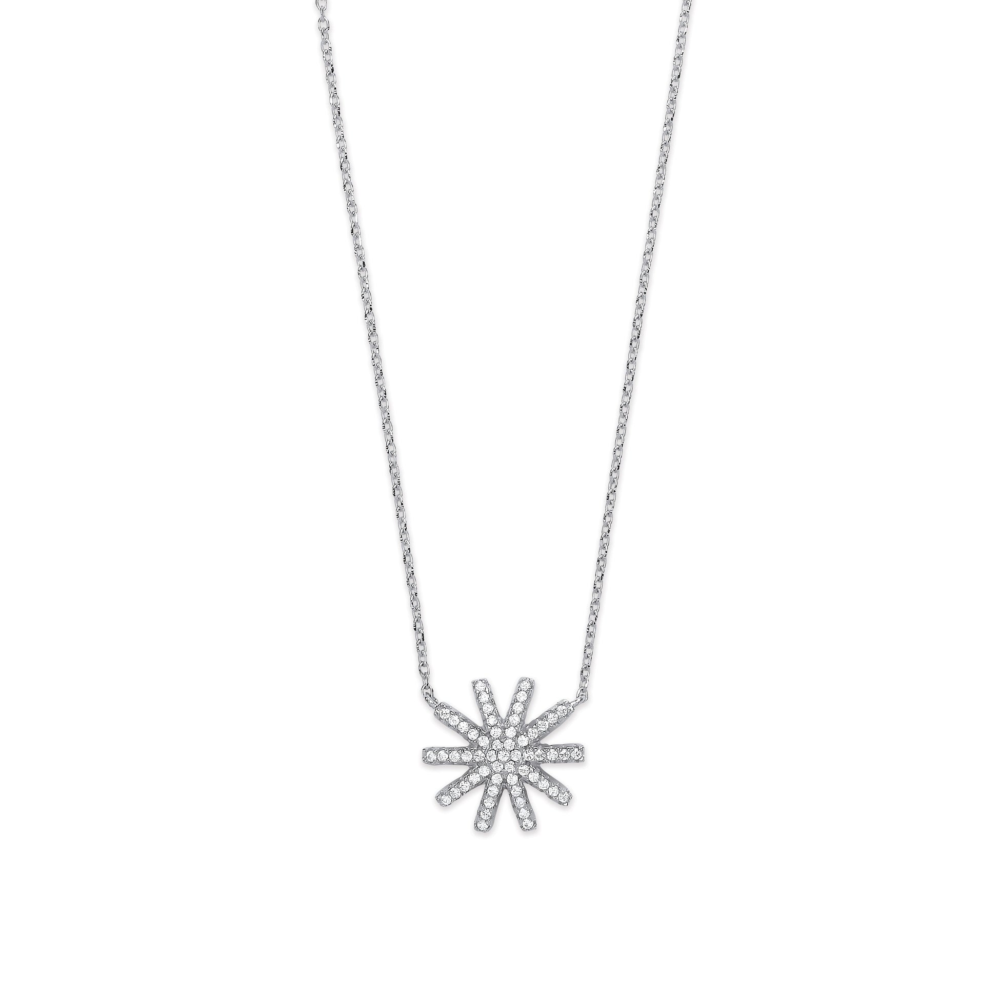 This exquisite sterling silver necklace features a stunning Cubic Zirconia starburst pendant, adding a touch of elegance to any outfit. The intricate design strikes the perfect balance between understated sophistication and eye-catching glamour.