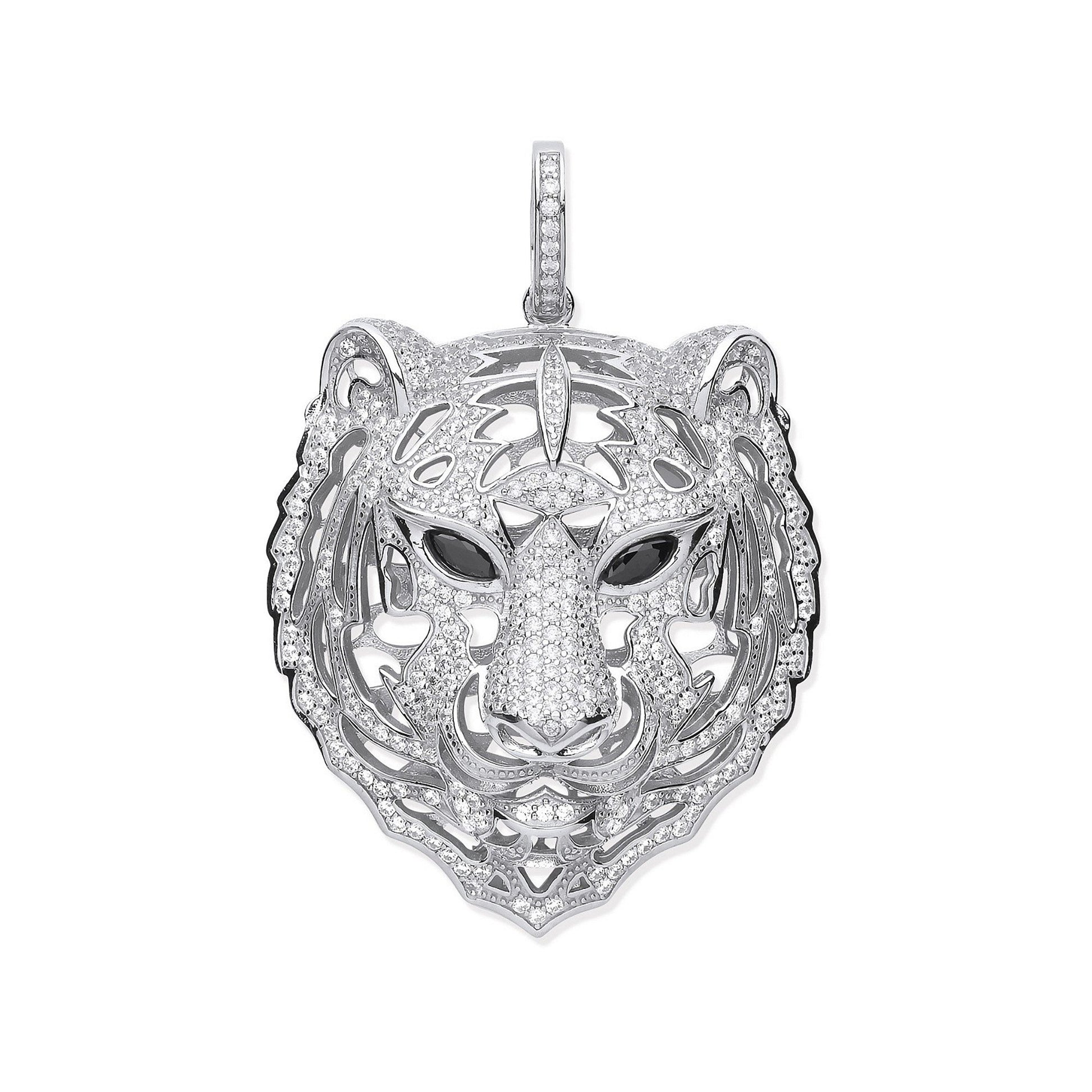 Silver Cubic Zirconia Tiger Head Black Cubic Zirconia Eyes Pendant