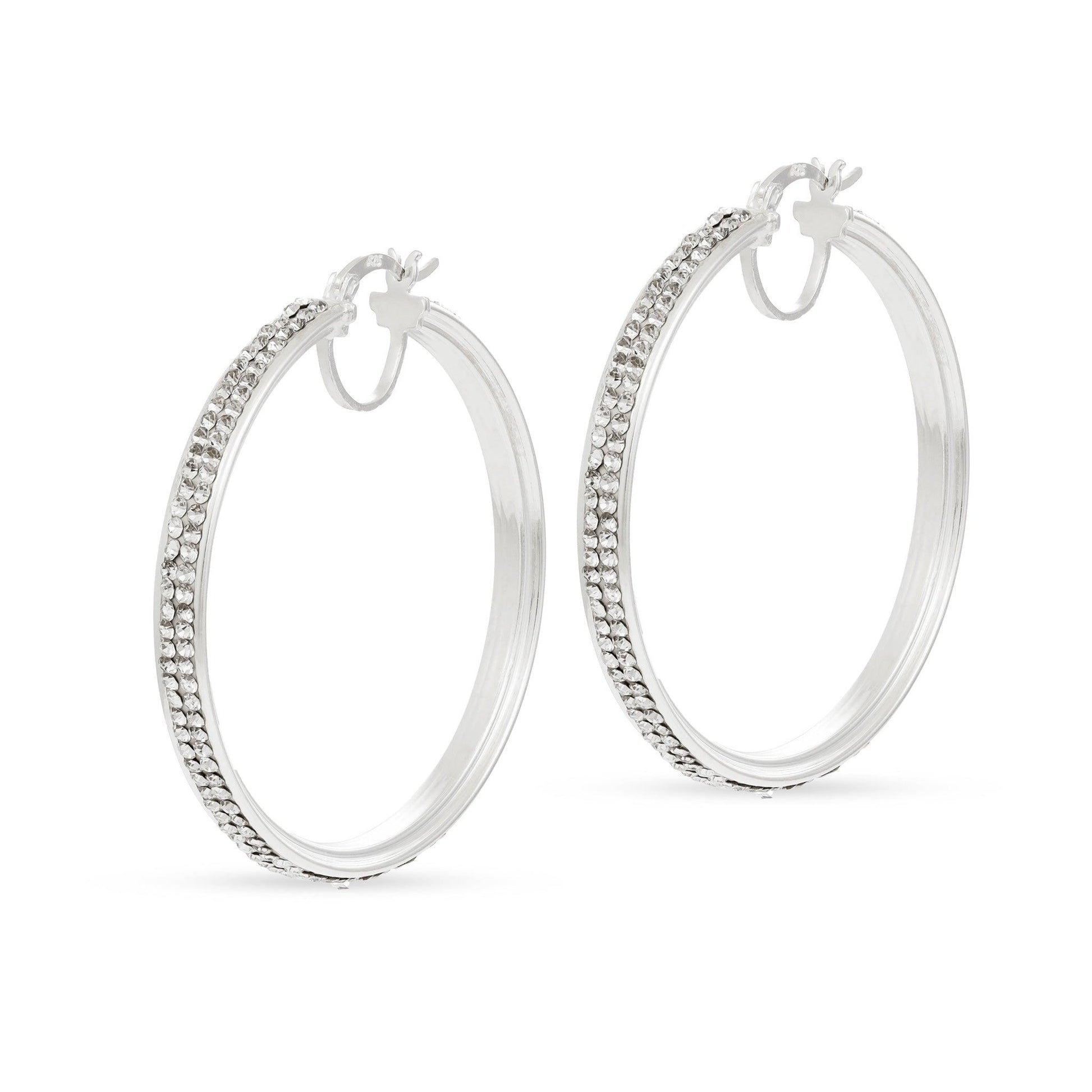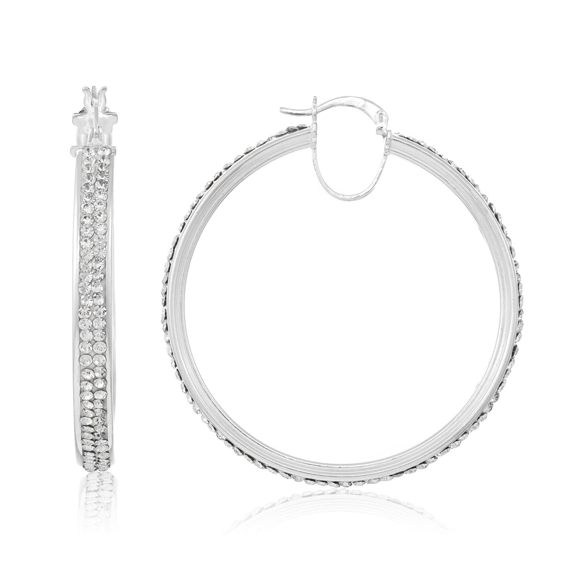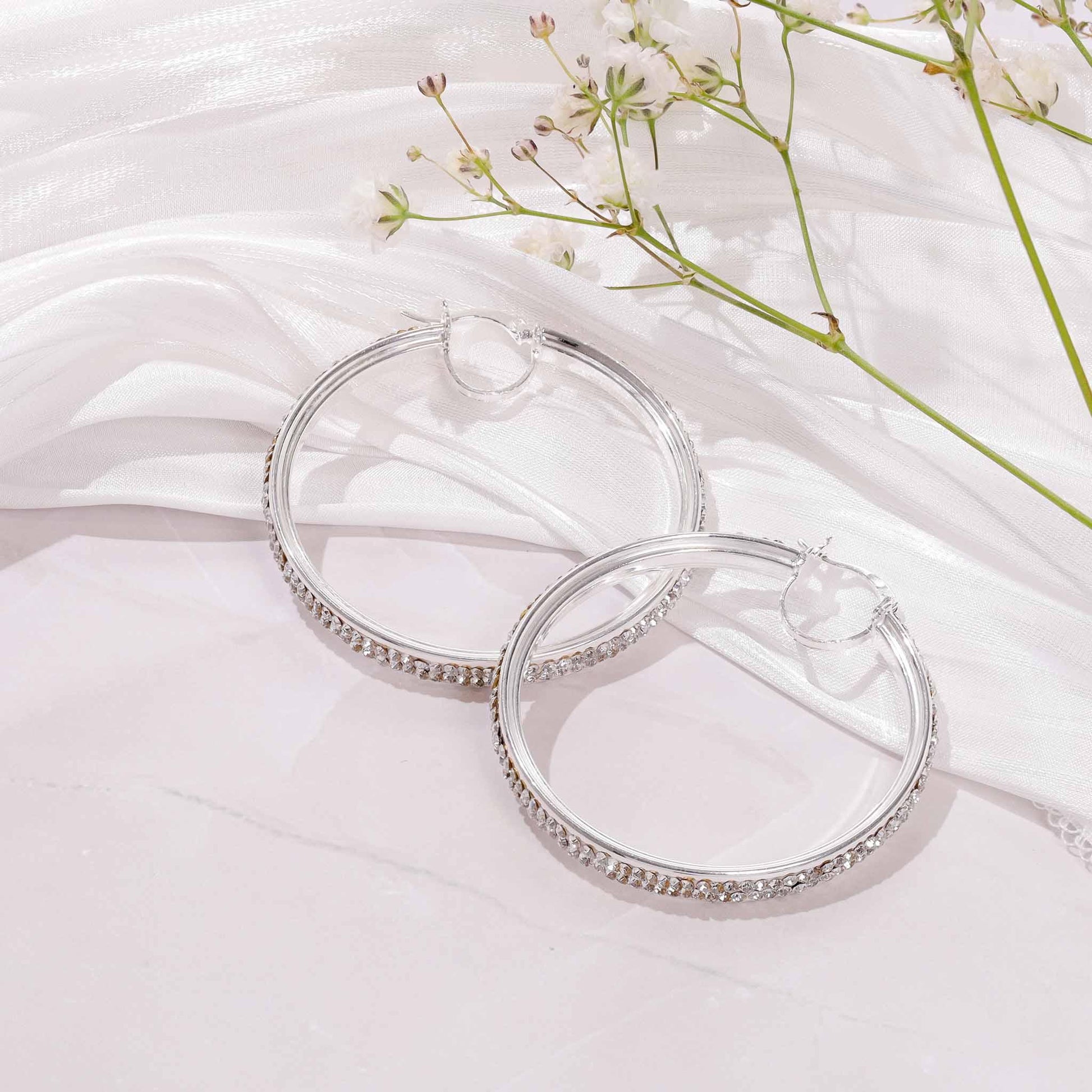Indulging in a touch of everyday sophistication, these Silver Large Hoop Crystal Earrings exude understated elegance with their sleek, sterling silver design. Crafted from high-quality metal with a rhodium coating, they boast a radiant white hue that complements any style.