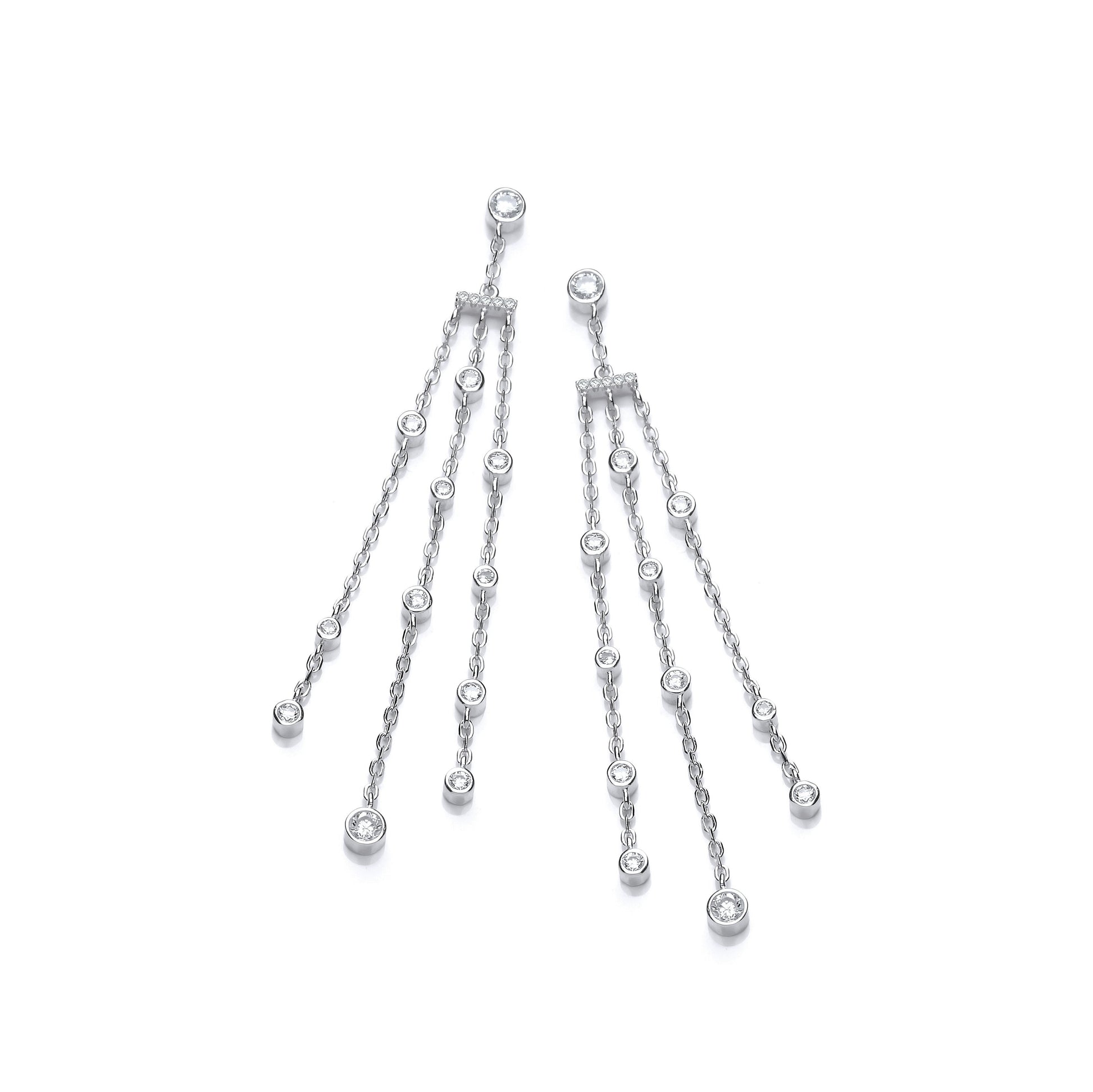 These exquisite silver drop earrings feature three delicate strings adorned with rubover cubic zirconias, exuding understated elegance. Indulging in a touch of everyday sophistication, they're perfect for dressing up or adding a hint of refinement to a casual outfit.