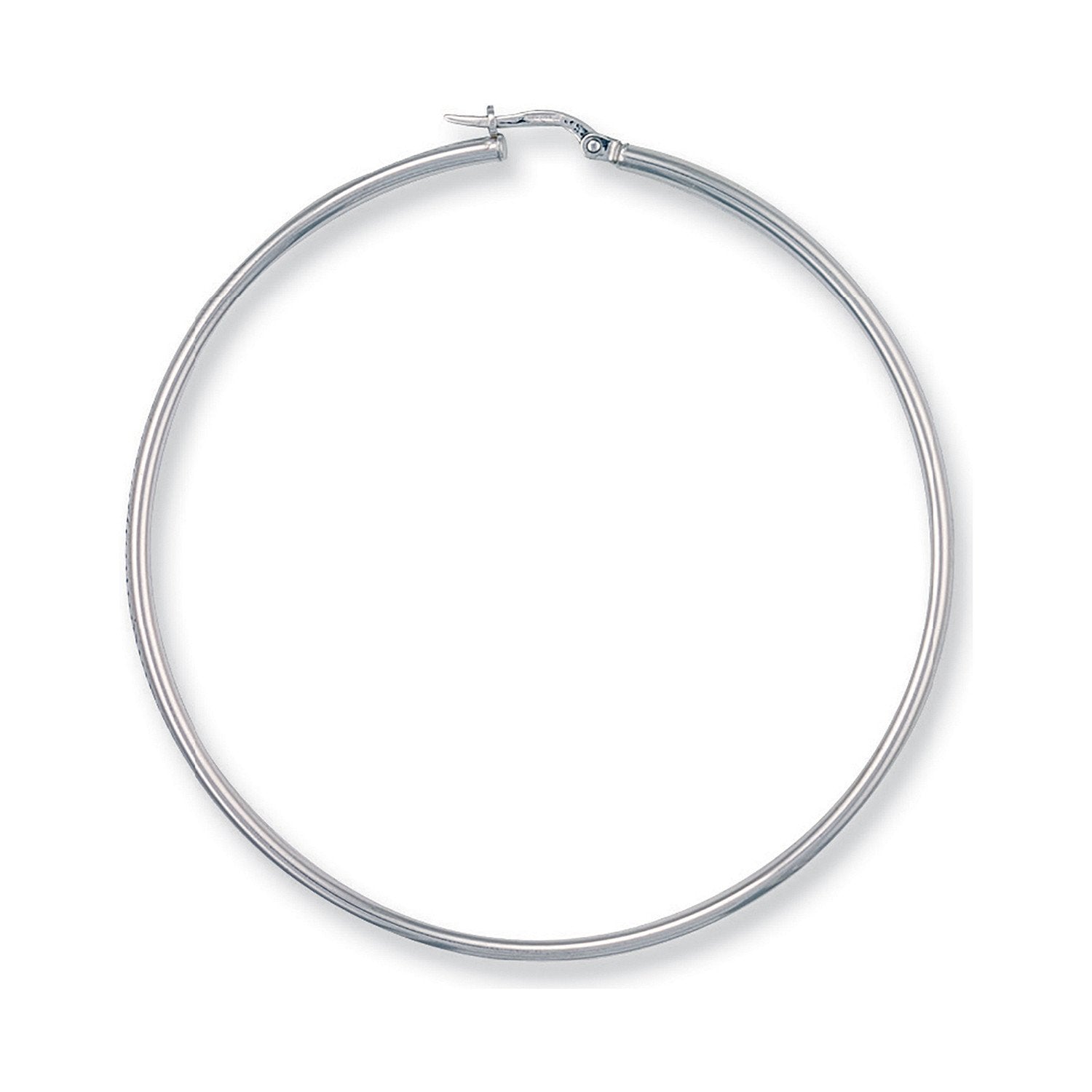 Strikes the perfect balance between classic style and modern simplicity, these 60mm round tube hoops are crafted from 9ct white gold with a rhodium coating for a luxurious finish. The hinged fastening ensures a secure and comfortable fit.