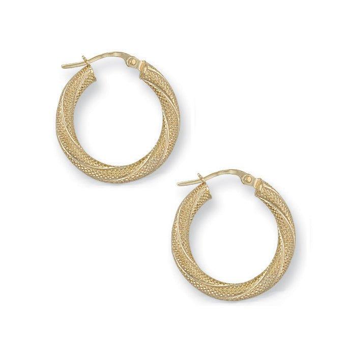 Indulging in a touch of everyday sophistication, these 9ct yellow gold hoop earrings exude understated elegance with their frosted, twisted design. Crafted from high-quality gold, they boast a luxurious feel that's perfect for dressing up or adding a subtle shine to everyday attire.