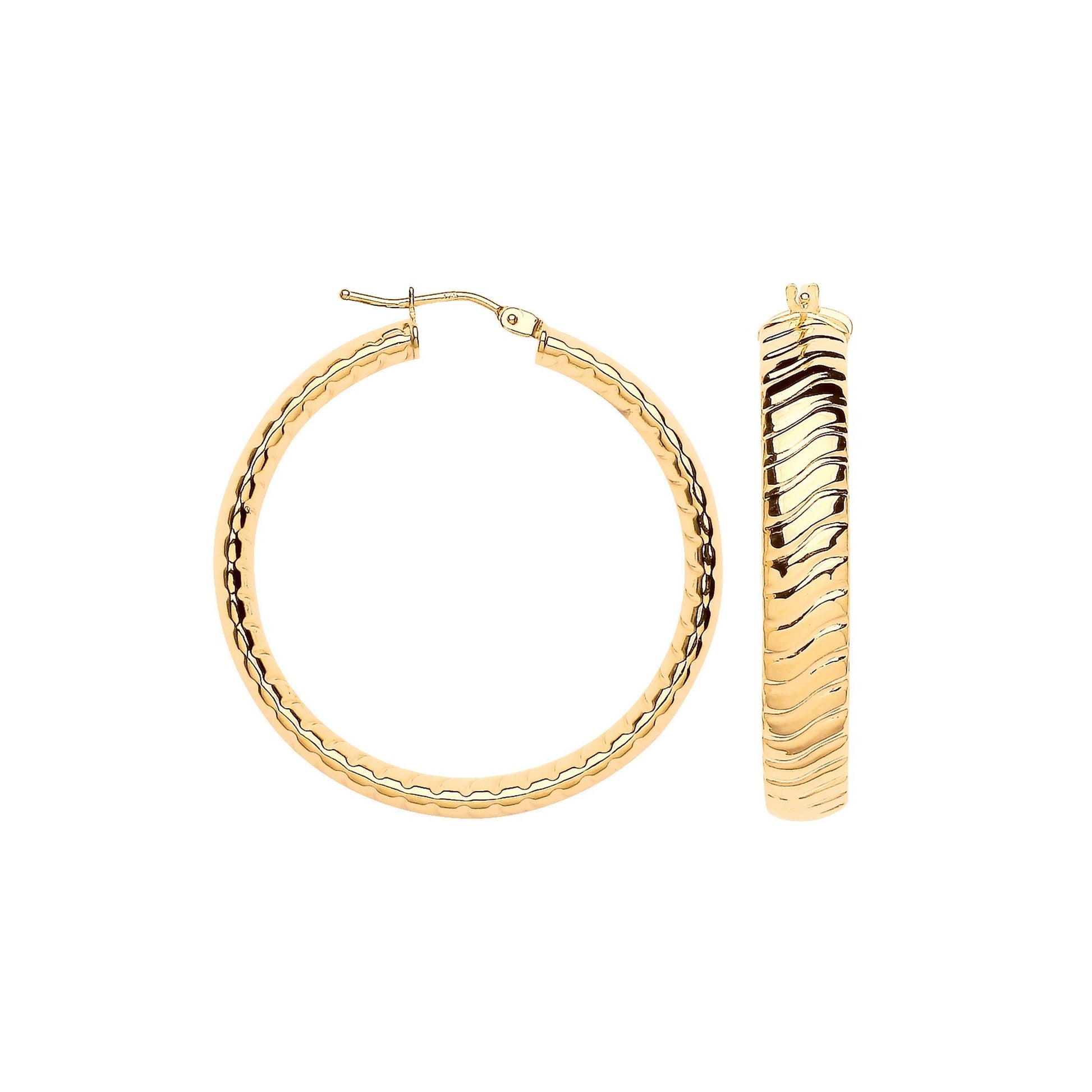 Indulging in a touch of everyday sophistication, these 36mm wavy ribbed hoop earrings in 9ct yellow gold add a refined elegance to any outfit. Their understated beauty makes them perfect for daily wear or as a special finishing touch.