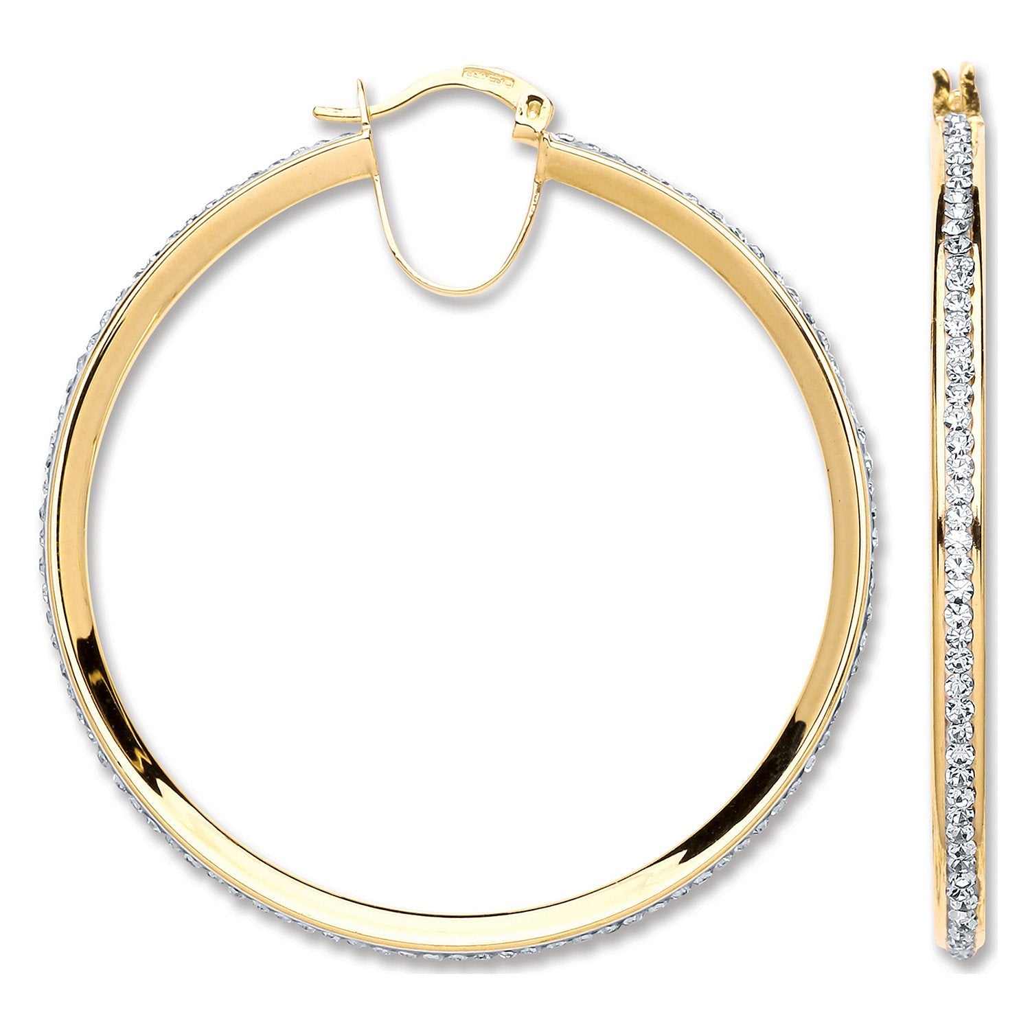 This elegant 46mm round crystal hoop earring in 9ct yellow gold strikes the perfect balance between understated sophistication and glamour, making it a versatile addition to any jewellery collection.