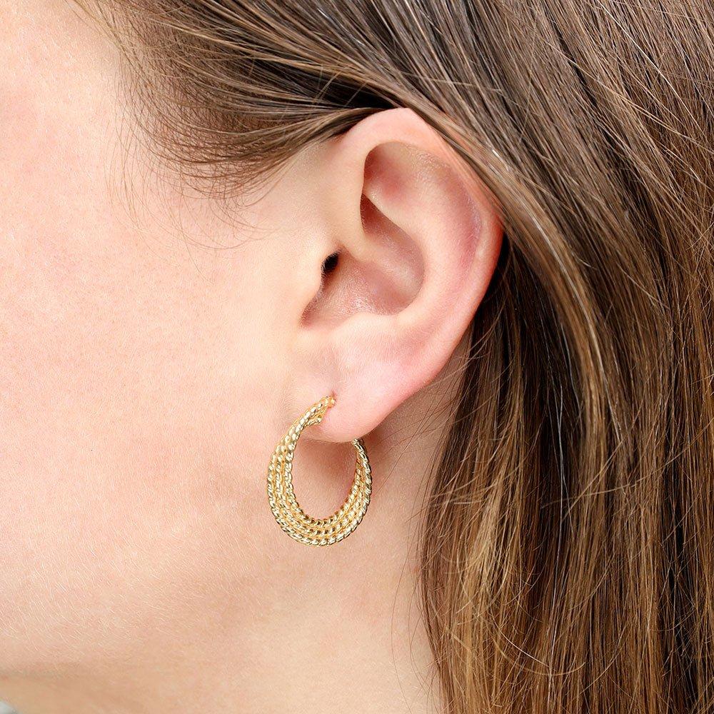 The ribbed texture and triple layer design add a delightful tactile quality, while the hinged fastening ensures a secure and comfortable fit. Indulging in a touch of everyday sophistication, these earrings are perfect for dressing up or adding a polished finish to a more casual look.